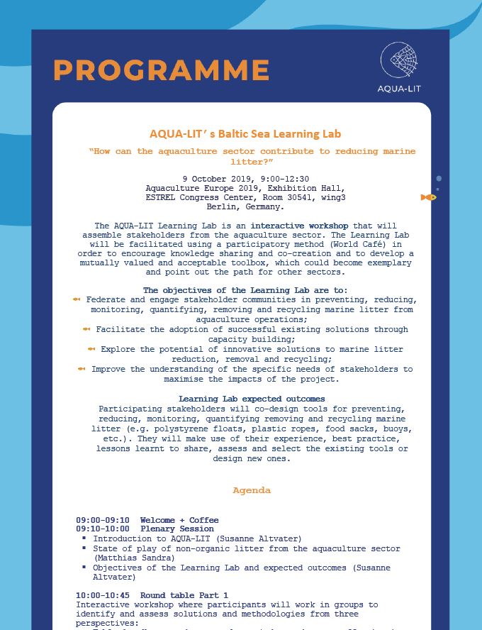The Learning Lab will have a highly interactive format encouraging participants to exchange their insights and opinions about the issue of litter in aquaculture and discuss possible solutions.
