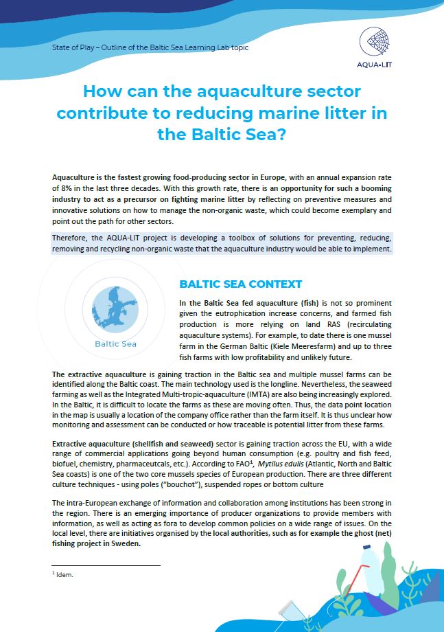 - Engage different types of stakeholders such as aquaculture farmers, manufacturers, designers, academics, processing companies or administration in preventing, reducing, monitoring, quantifying, removing and recycling marine litter from aquaculture operations;