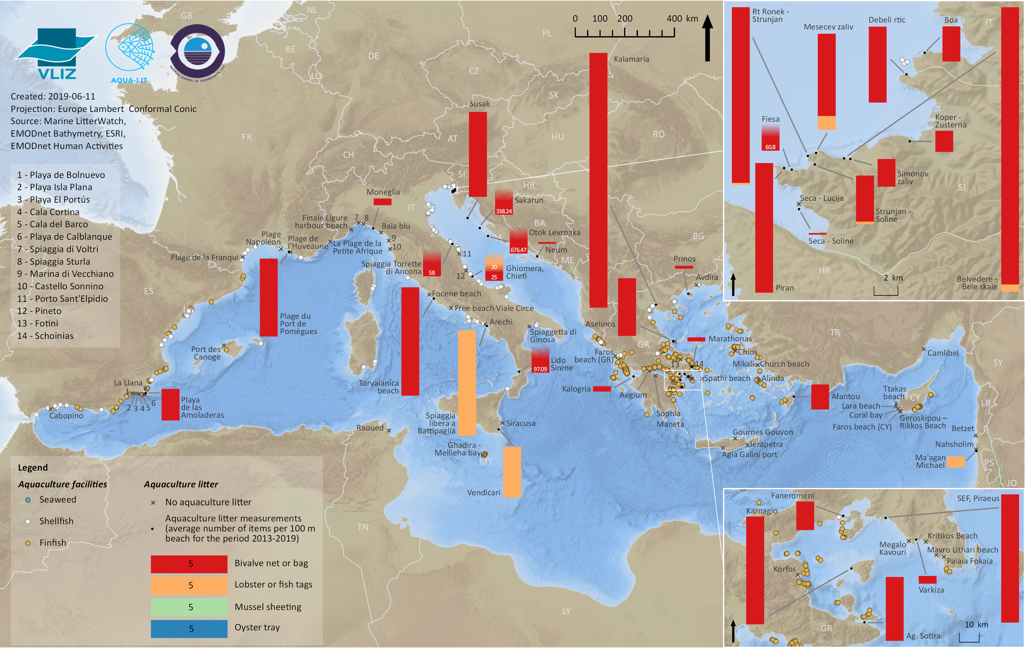 Through the collection of data from existing databases and sources (such as: Legambiente, OSPAR, HELCOM, Marine LitterWatch), EU funded project (DeFishGear and CleanSeaLife) and literature research, a solid database of the main types of aquaculture marine debris was built. Moreover, using the coordinates of previous monitoring programmes, accurate maps showing aquaculture marine litter in the three sea basins (Mediterranean, North Sea and Baltic Sea) were developed.