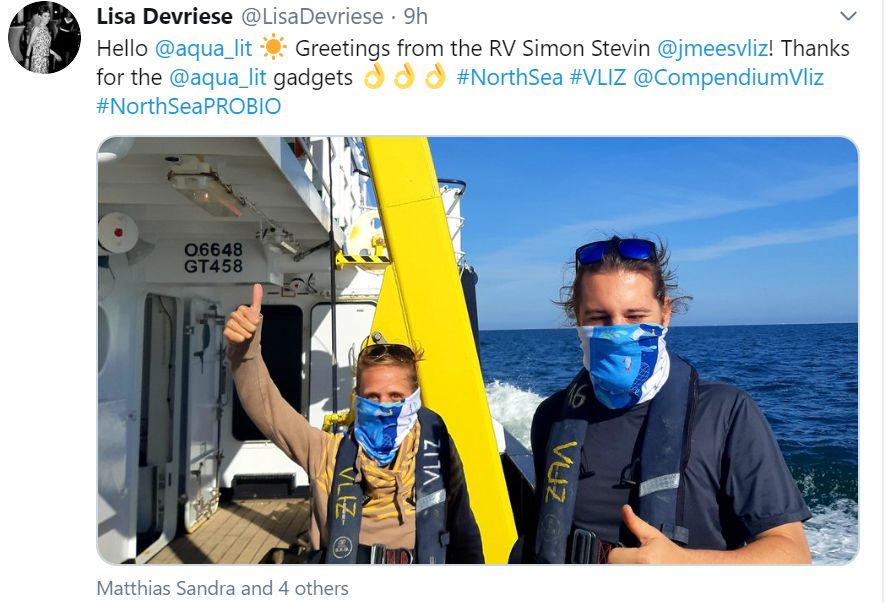 VLIZ Team on the Research Vessel Simon Stevin and Eleonora from CleanSea LIFE project using beautiful AQUA-LIT Bandana as a protective mask