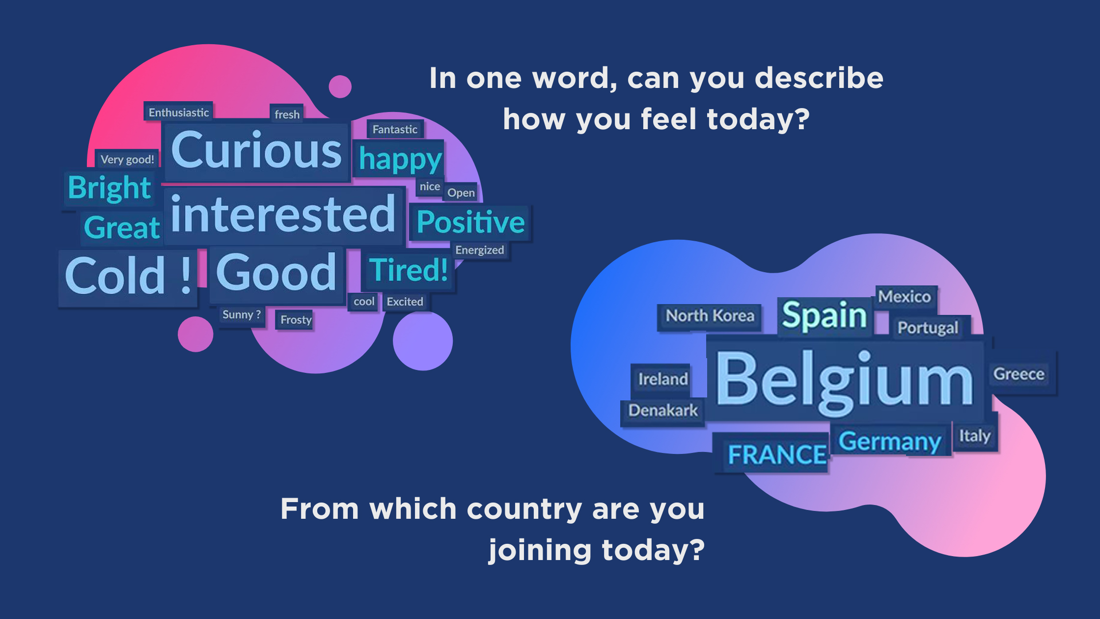 The event that hosted more than 120 participants, started with a warm-up slido session where the location and emotions of participants were shared. "Curious, Interested and Cold" seemed to be the most common feelings among the crowd in this exciting winter event. As for the location, most people seemed to be based in Belgium, and two non-EU interesting locations: North Korea and Mexico.