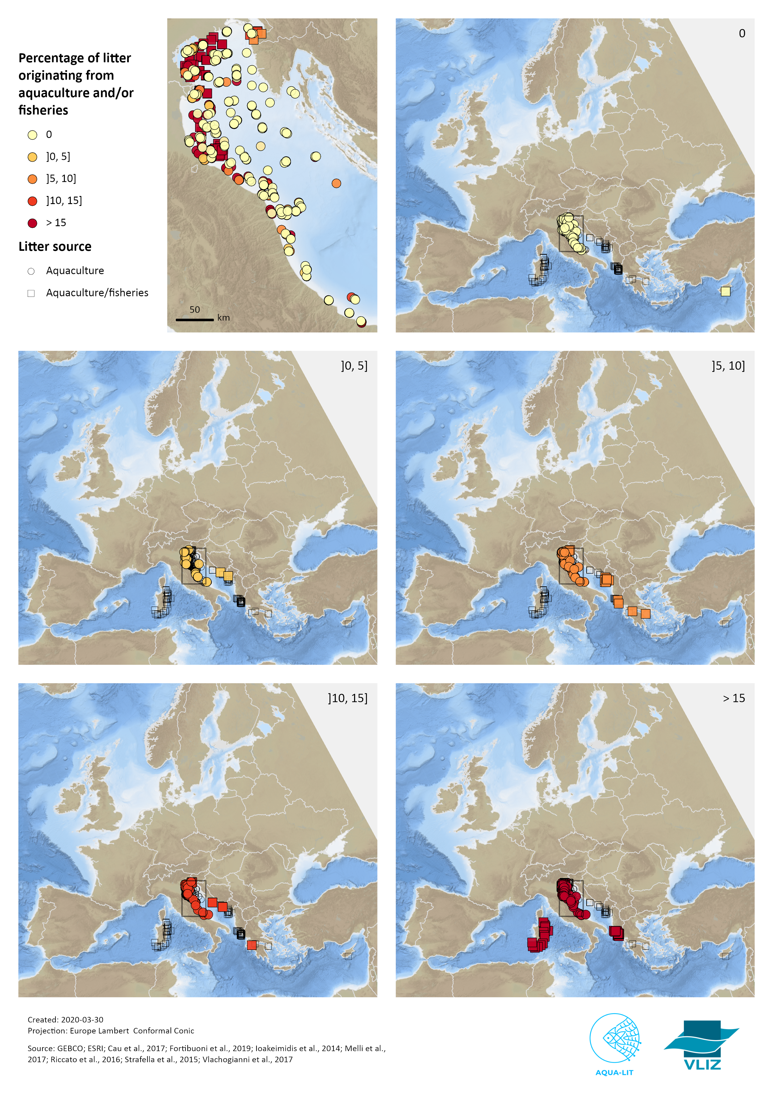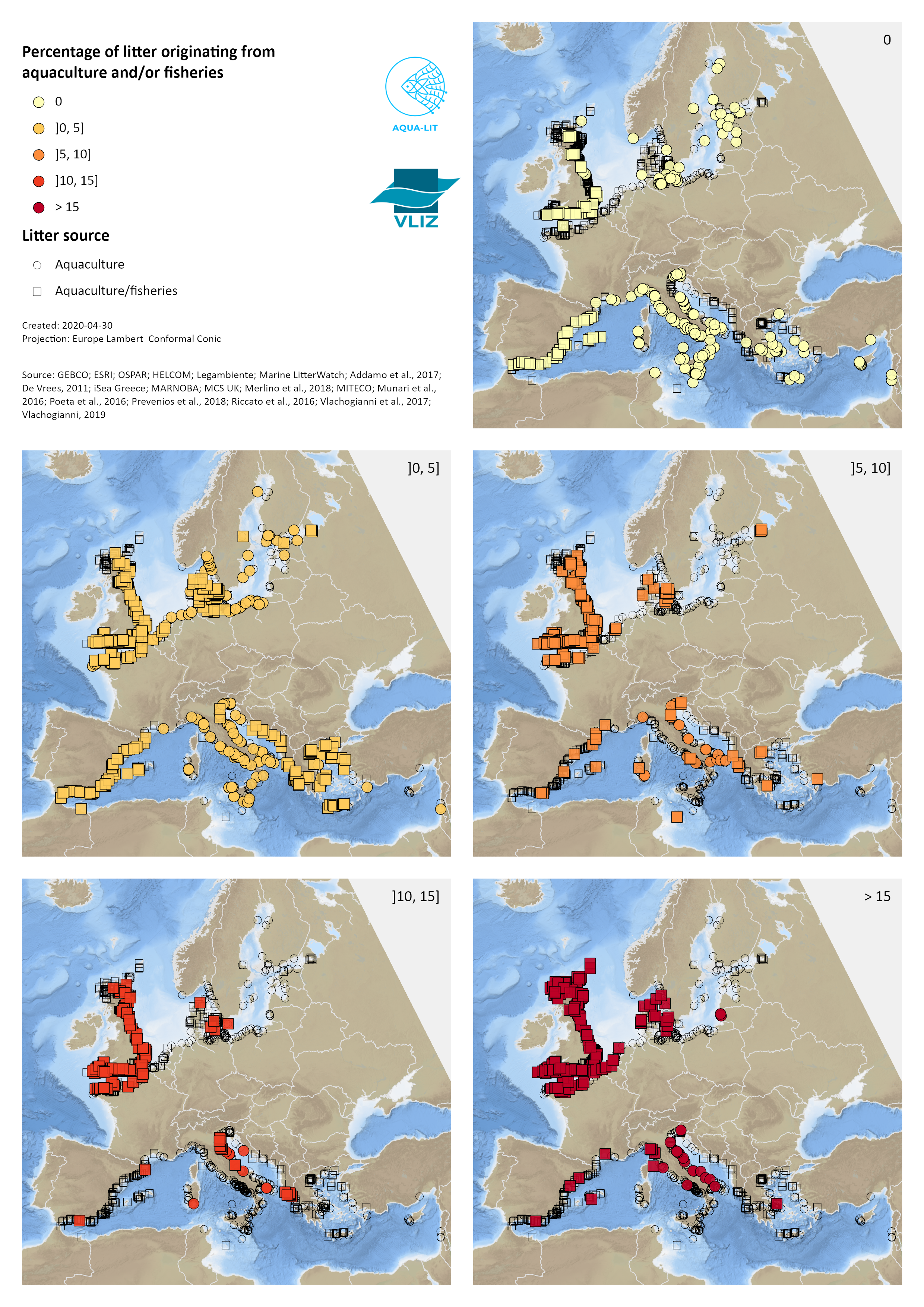 These maps intend to get a clear view of the wide range of data by relating the % of litter originating from aquaculture and/or fisheries to the fate (beach, floating and seafloor litter) of the collected litter.