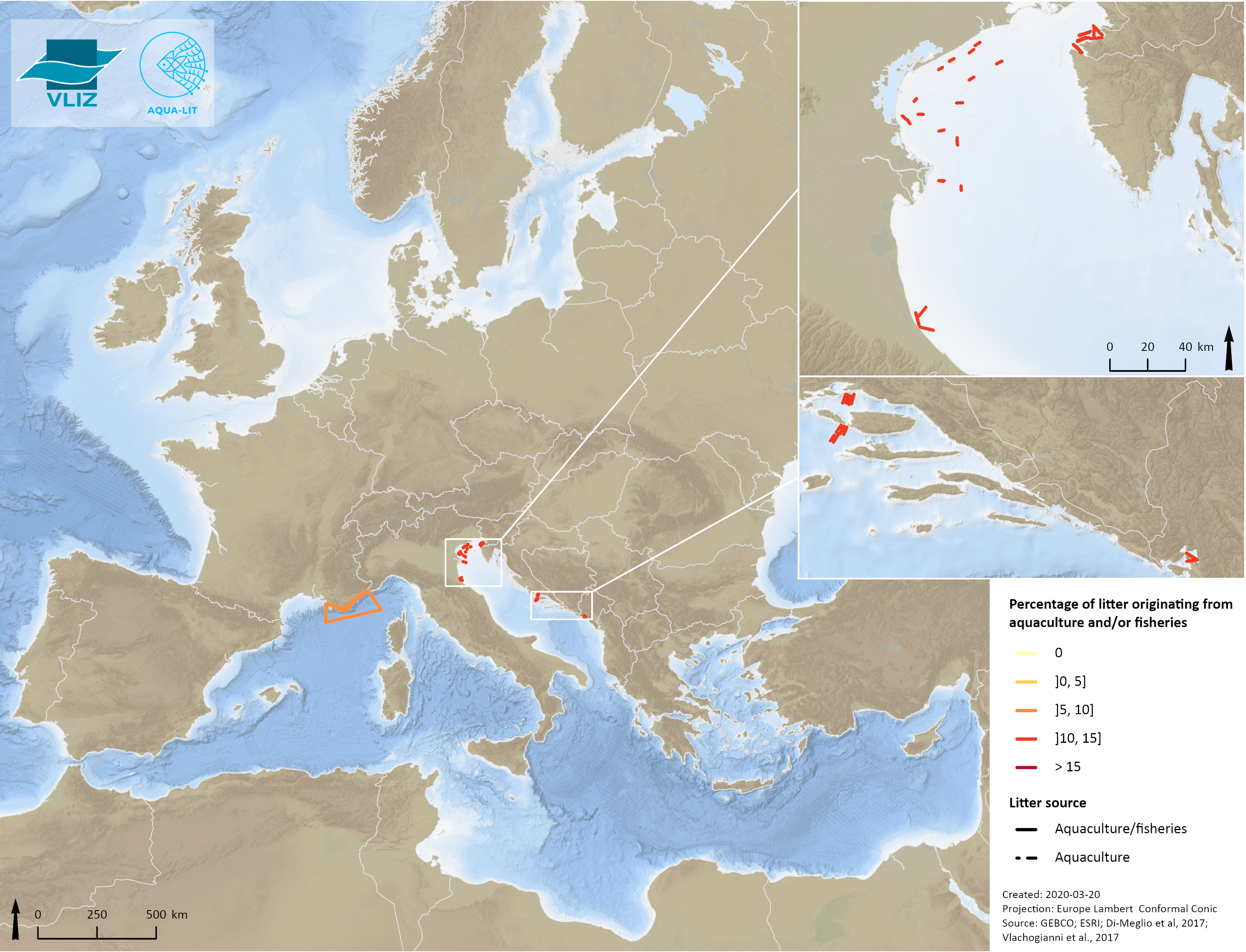 Seafloor litter data are exclusively available for the Mediterranean Sea basin, more specifically the Adriatic Sea, parts of the Ionian Sea, and the Eastern and Southern waters of Sardinia. Interestingly, in the Adriatic Sea, coastal regions show higher proportions of aquaculture related debris than offshore locations. The average percentage of aquaculture related debris on the seafloor is 14.8%. Nevertheless, when only the specific items are taking into account, the average percentage of aquaculture debris is only 11.6%. For same reasons as explained in the section ’Beach litter’, the latter can be seen as the lower limit of aquaculture related debris on the seafloor.